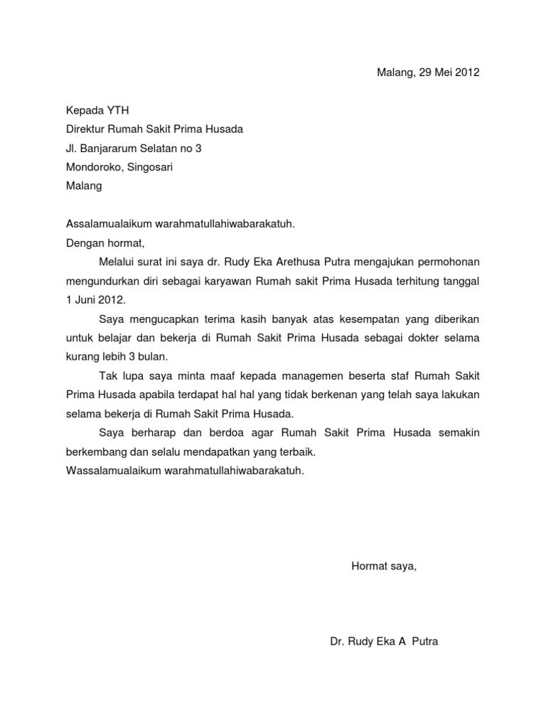 Surat pengunduran diri rumah sakit. Alasan pengunduran diri seoarang karyawan bisa beraneka ragam. Contoh surat pengunduran diri dalam bahasa inggris. Contoh surat resign resmi atau contoh surat pengunduran diri yang baik dan benar serta sopan biasanya dipakai di dunia kerja, organisasi & guru di sekolah. Contoh surat pengunduran diri adalah jenis surat yang banyak diperlukan saat ini baik di kantor ia bekerja maupun di sekolah sekolah juga organisasi tempat dia mulai dari bosan kondisi mendesak hingga perintah dari atasan sendiri.